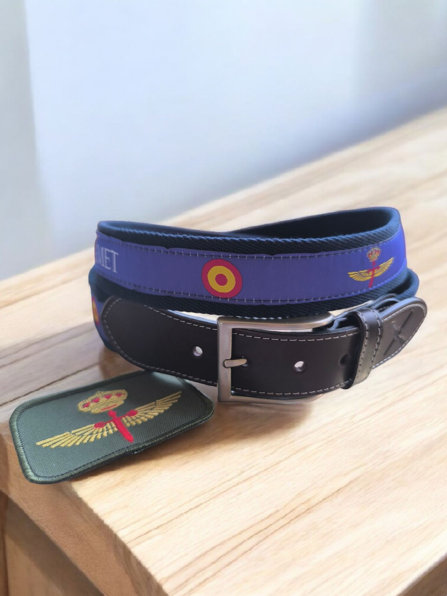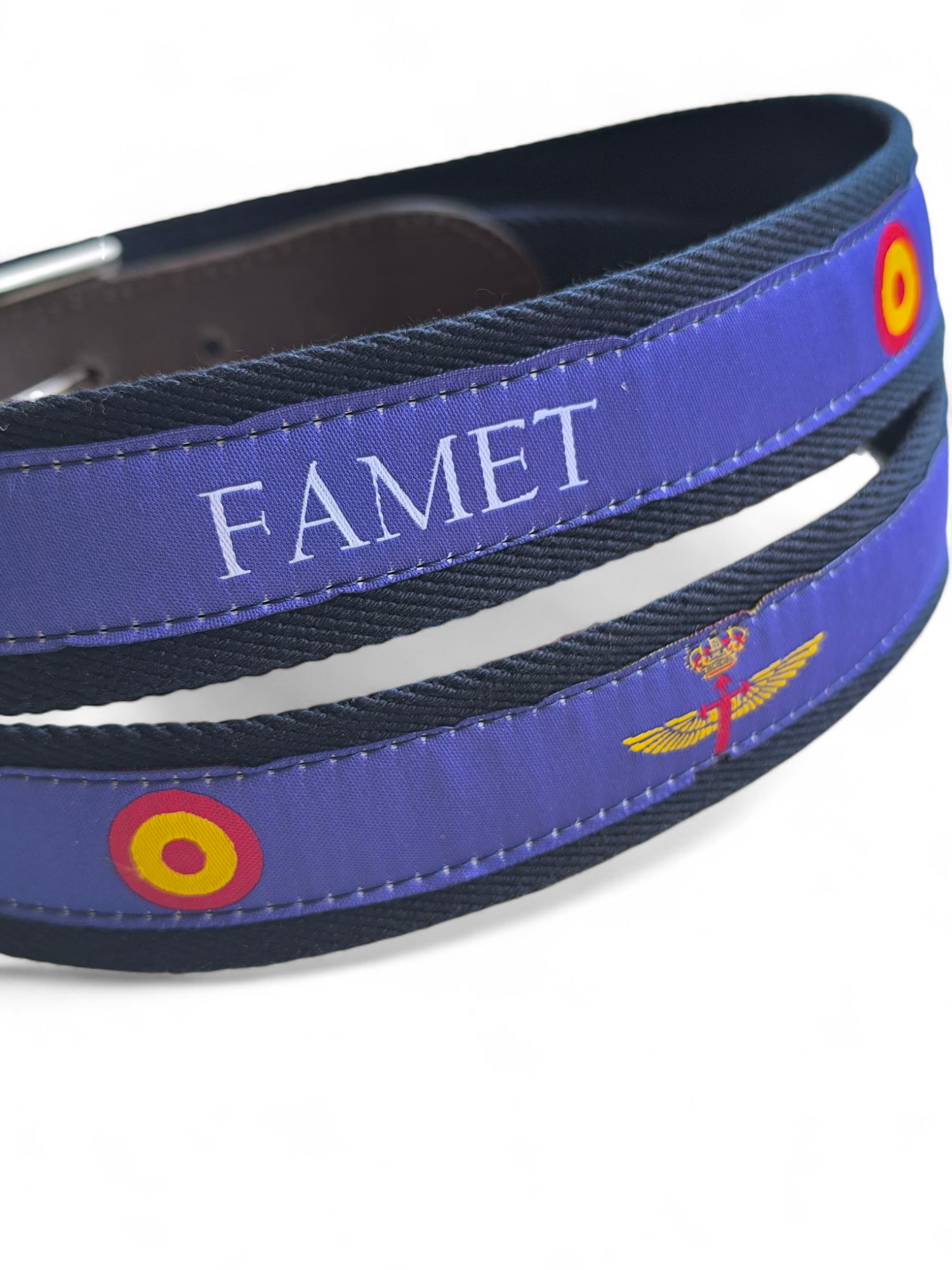 Descubre el cinturón de las FAMET con regulador, un accesorio distintivo con cinta central bordada, ideal para entusiastas de la aviación militar y del Ejército de Tierra. Confeccionado con materiales de alta calidad, ofrece durabilidad y un estilo único que rinde homenaje a las Fuerzas Aeromóviles del Ejército de Tierra. Color: MARINO.