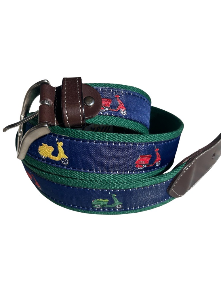 Cinturón deportivo «MOTOS VESPA», exclusivo THE CREW, con diseño original de vespas clásicas. Ideal para amantes del motor. Un accesorio único que combina estilo y pasión. Color: VERDE. Ancho 35 mm.